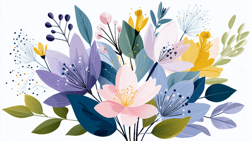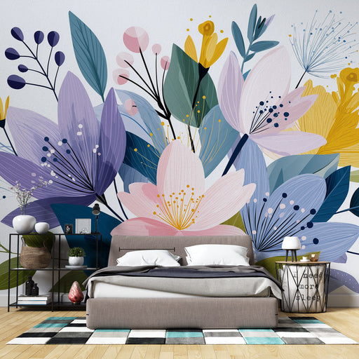 Ver todos los detallesPapel pintado de mural floral moderno | Ramo delicado con flores coloridas y hojas variadas