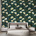 Papel pintado floral | Flores delicadas y follaje dorado sobre un fondo azul profundo