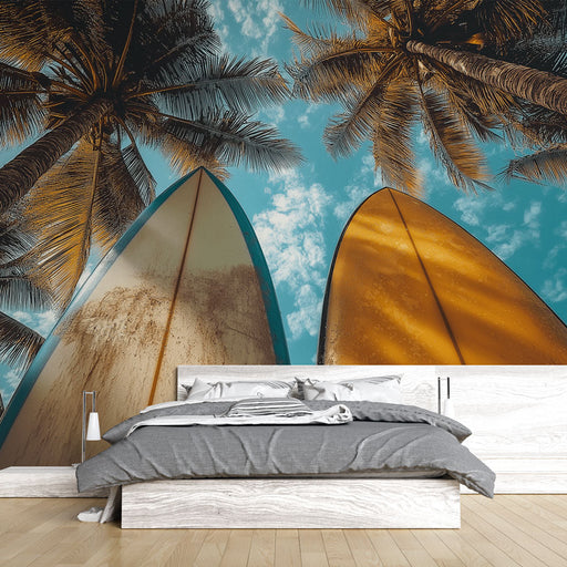 Papel pintado surf | Tabla de surf con atardecer estilizado