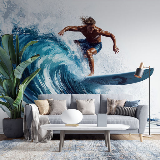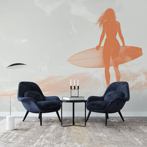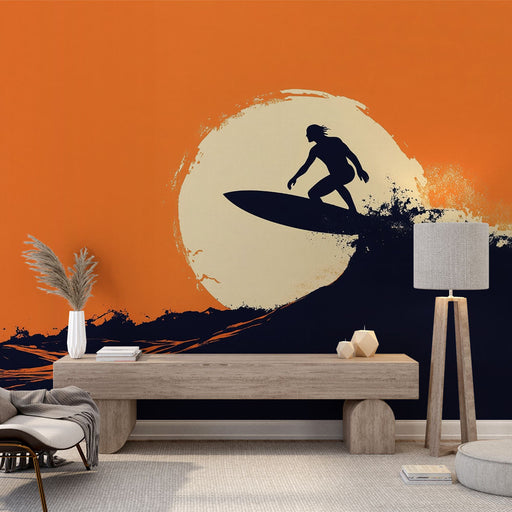 Descubre nuestro papel pintado único que presenta una tabla de surf erguida poderosamente sobre las olas tumultuosas, con un fondo de un atardecer rojo. Este diseño gráfico evoca una atmósfera retro, llena de dinamismo y energía, mientras celebra el espíritu del surf y la aventura.