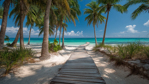 WonderMuralMeie eksklusiivne disainitapet kutsub esile troopilise ranna, kus looduslik puidust rada lookleb läbi võimsate palmipuude. Sädelev türkiissinine ve...