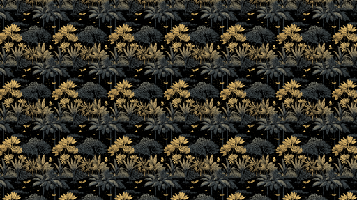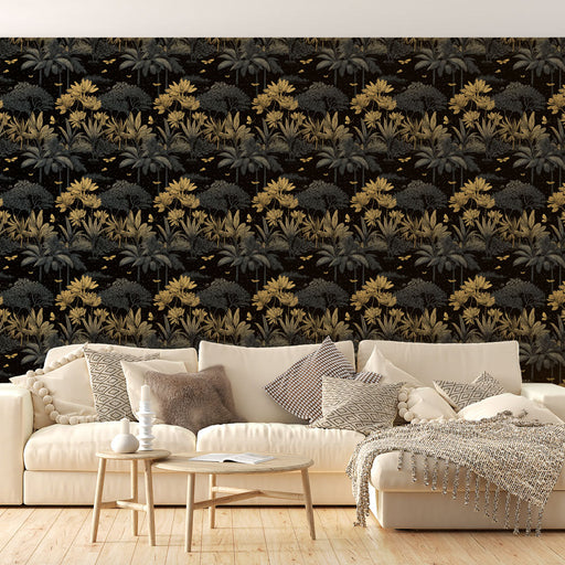 WonderMuralSee tapeet kutsub esile troopilise džungli, näidates rikkalikke mustrilisi taimi ja kuldseid lilli sügaval mustal taustal. Musta ja kulla kombinats...