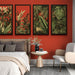Avastage meie suurepärane troopiline tapeet, mis sisaldab lopsakat mustrit erinevatest lehtedest intensiivsel punasel taustal. Erinevad rohelised toonid koos kuldsete puudutustega loovad silmatorkava kontrasti ja toovad teie eluruumi elavat energiat.