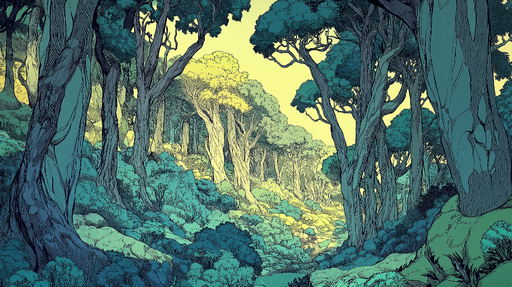 WonderMuralSee seinamaaling meenutab salapärast metsamaastikku, kus stiliseeritud puud seisavad sinistes ja rohelistes toonides, mida valgustavad pehmed kolla...