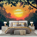 Avastage meie kaunist fototapeeti, mis kujutab värvilist päikeseloojangut tiheda metsa keskel. Oranžide ja roosade soojade toonide segunemine roheliste puude varjudega loob rahuliku ja vaikse atmosfääri.