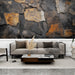 See seinamaalingul on suurepärane looduskivi muster, mis ühendab tumedad toonid ja oranžid esiletõstmised kaasaegseks ja elegantseks kaunistuseks. Kivide mitmekesised tekstuurid loovad soojas ja tugevas õhkkonnas, mis on ideaalne iseloomu lisamiseks teie eluruumidesse.