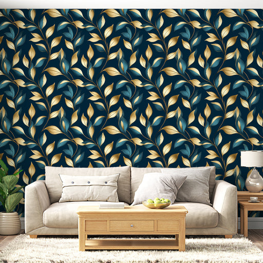 WonderMuralSee seinamaalingul on ülev rütm kuldsetest ja sinistest lehtedest, mis graatsiliselt põimuvad mustale taustale. Nende rikaste värvide kombinatsioon...