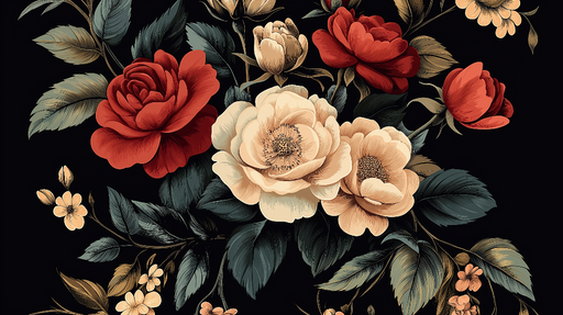 WonderMuralSee seinamaalingul on luksuslik mustriga punased roosid ja kreemjad anemoonid, mida ümbritsevad õrnad lehed, kõik puhkamas mustal taustal, mis rõhu...