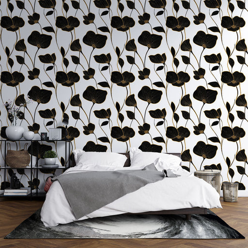 WonderMuralSee tapeet on kaunistatud luksusliku mustriga valgetest lilledest, mis on õrnalt joonistatud, koos elegantsete lehtedega kuldsetes ja mustades toon...