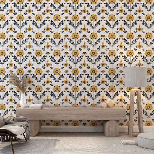 WonderMuralSee tapeet rõhutab õrna lillelise mustrit, kus kollased lilled paistavad kreemja tausta peal silma, luues sooja ja kutsuva atmosfääri. Mustad illus...