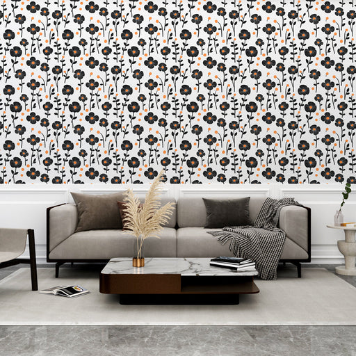 WonderMuralSee tapeet rõhutab silmatorkavat lillelist mustrit, kus mustad lilled on segatud oranzide puudutustega, kõik heledal valgel taustal. See disain too...