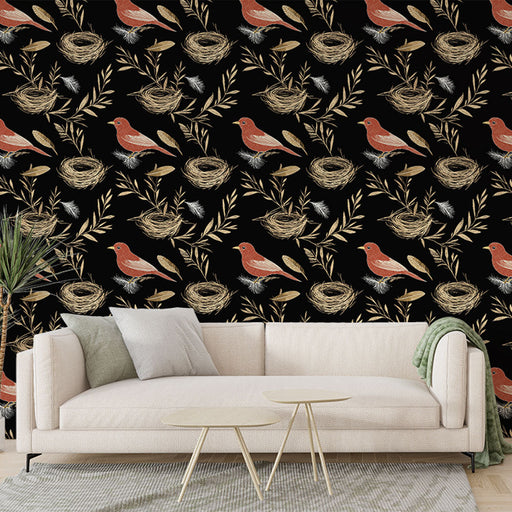 WonderMuralSee tapeet er eristatud elava mustriga väikeste punaste lindude, pesade ja kuldsete lehtedega. Must taust võimaldab lindude erksatel värvidel ja ku...