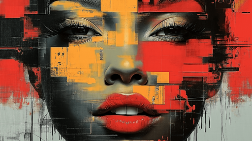 WonderMuralSee kaasakiskuv tapeet sisaldab stiilise näo, mis on integreeritud abstraktsesse kujundisse, kus elavate värvide plokid nagu punane ja kollane loov...