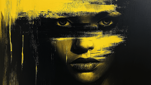 WonderMuralSee lummav foto tapeet näitab sügavat mustas kujutatud abstraktset nägu, mida rõhutavad erksad kollased värvid, mis liiguvad pildil, luues silmator...