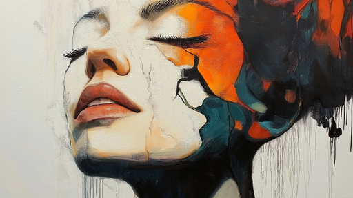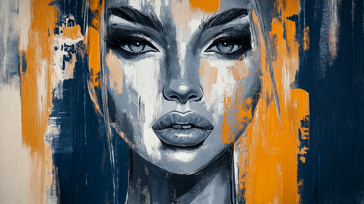 WonderMuralSee seinamaalingul on lummav abstraktne portree, mis rõhutab peent nägu elavate oranžide, roheliste ja mustade toonidega. Julged pintslitõmbed ja v...