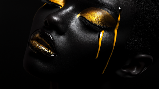 WonderMuralSee lummav foto tapeet näitab naise nägu mustas ja kuldse toonis, mida täiendavad erksad värviplekid. Tumedate ja kuldsete toonide kasutamine loob ...