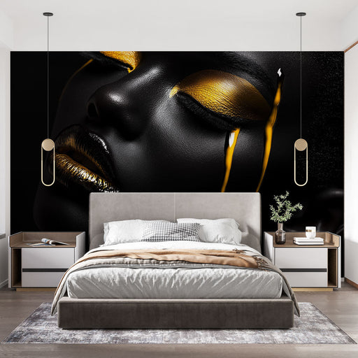 WonderMuralSee seinamaaling kujutab endast intensiivset ja salapärast ilu, millel on õrna näojoonega nägu kuldse valguse käes. Matte must nahk kontrasteerub k...