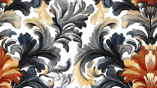 WonderMuralSee shabby chic fototapeet omab suurepärast baarokkõrvalist mustrit, segades sooje toone oranž, hall ja must ereda valge taustaga. Mustrite peened ...