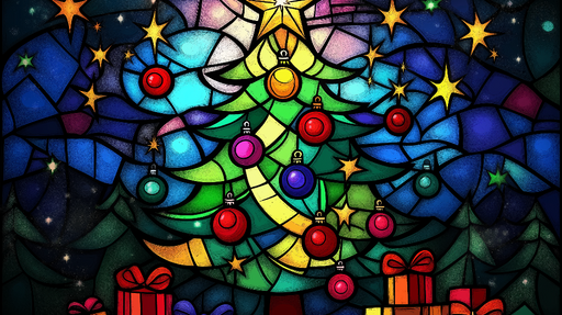 Vaata täielikke üksikasjuJõulude vitraaž-tapet | Värviline jõulupuu tähtede ja kingitustega