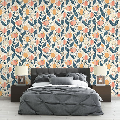 WonderMuralSee ergas Mural Wallpaper omab harmoonilist mustrit roosadest tulpidest ja oranžidest puuviljadest, milles on stiliseeritud lehed heledal taustal. ...