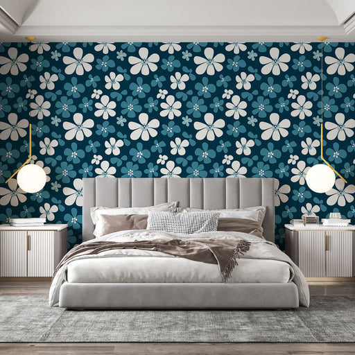 WonderMuralSee tapeet on elegantse lillelise mustriga, kus on suured valged lilled ja väikesed sinised lilled, mis paistavad silma sügava tume sinise taustal....