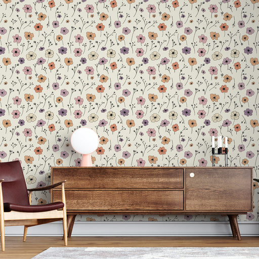 WonderMuralSee tapeet on ilusa lillelise mustriga, kus segunevad oranžid lilled kuivade rohude ja õrnade vartega, kõik heledal taustal, mis valgustab ruumi. B...