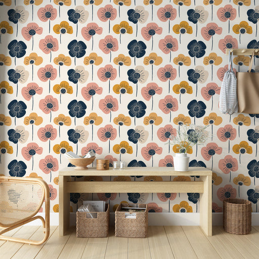 WonderMuralMeie tapeetil on elav muster värvilistest lilledest heledal taustal, luues rõõmsa ja kutsuva ruumi. Punase, kollase, sinise ja musta toonid sulandu...