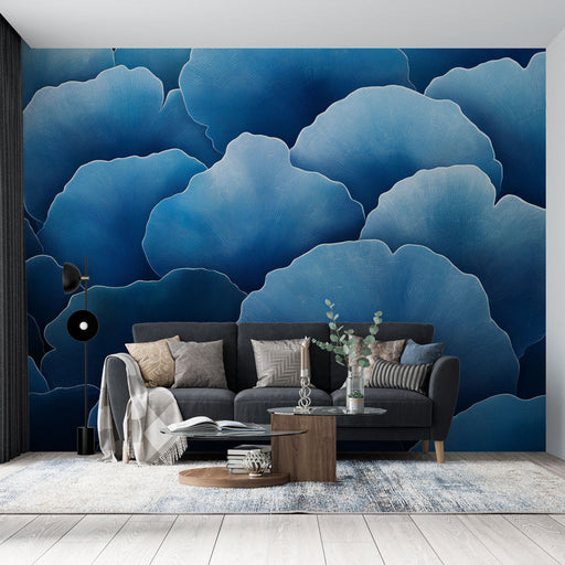 Vaata täielikke üksikasjuMuraaltapeet mäed ja pilved | Stiliseeritud maastik lõigatud paberis sinistes toonides