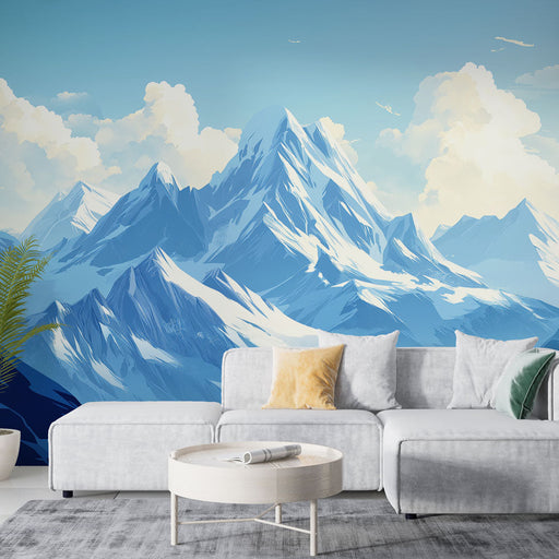 WonderMuralSee seinamaaling illustreerib suurejoonelist mägimaastikku, kus on lumised tipud ja suured hõljuvad pilved. Sinised toonid loovad rahustava atmosfä...