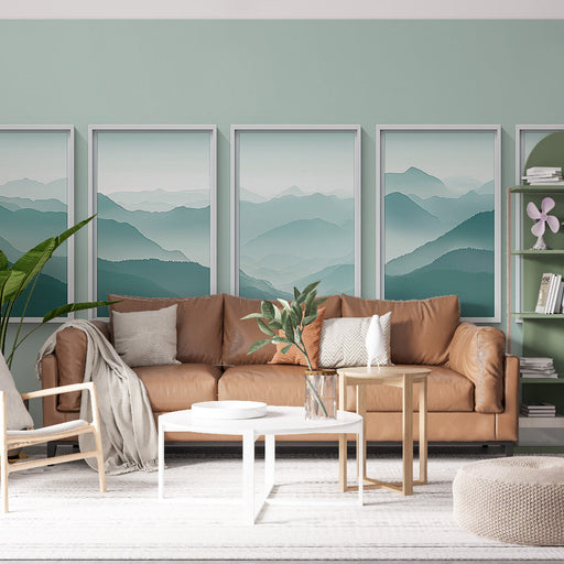 WonderMuralSee seinamaaling näitab suurepärast mägismaastikku, mis on udusse mähitud, pakkudes rahulikku ja rahustavat õhkkonda. Rohelise ja sinise toonid sul...