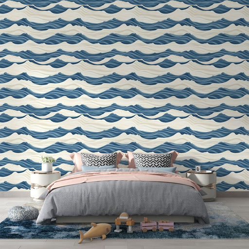 WonderMuralSee seinamaaling meenutab rahustavat ookeani lainete liikumist oma mereväe siniste ja kreemjate värvidega lainelistes kujundites, luues värskendava...