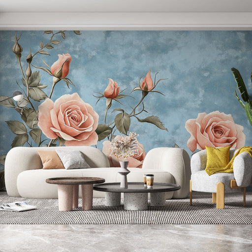WonderMuralSee seinamaaling rõhutab suurepärast pastelseid roose, õrnalt ümbritsetud lehestikuga pehmel sinisel taustal. Roosade harmoonilised toonid ja rahus...
