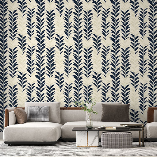 WonderMuralMeie ilus Fototapet pakub elegantset mustrit stiilistatud lehtedega tumesinisel kreemilisel taustal, luues harmoonilise ja rahustava kontrasti. Leh...