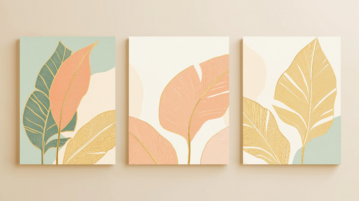 WonderMuralSee seinamaalingul on minimalistlik disain, mis näitab õrnu stiliseeritud lehti soojades ja pehmetes toonides, nagu beež, terrakota ja pastelne roh...