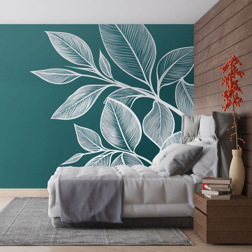 Vaata täielikke üksikasjuMuraaltapeet sinakasroheline lehestik | Stiilsed lehed heledal taustal