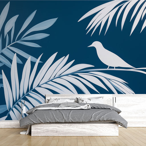 Vaata täielikke üksikasjuSeinapilt tapeet sinakasroheline lehestiku ja linnumustritega | Minimalistlik troopiline elegants