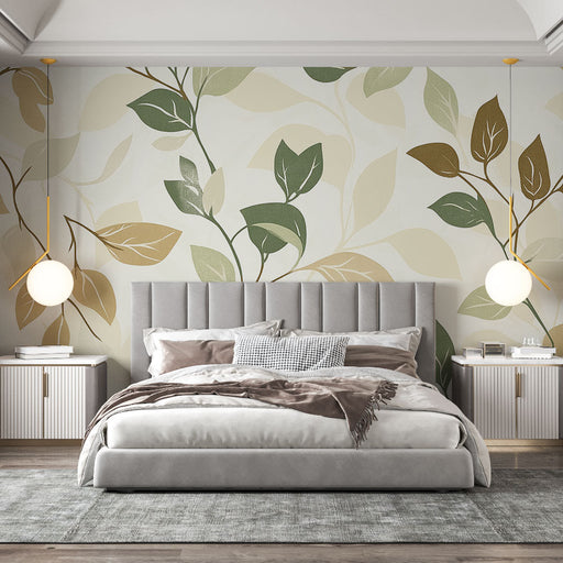 WonderMuralMeie õrn Foto Behang näitab võluvat mustrit roheliste ja kuldsete lehtedega rahustaval kreemilisel taustal, lisades teie interjöörile looduslikku p...