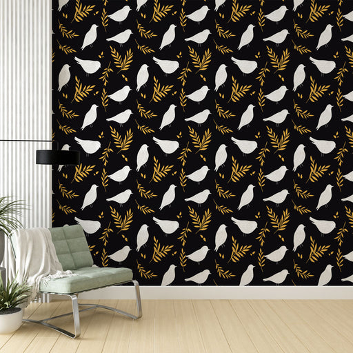 WonderMuralMeie tapeedil on kaunis muster valgetest lindudest, mis õrnalt istuvad okstel, mida kaunistavad kuldlehed, kõik sügava musta taustal, mis rõhutab d...