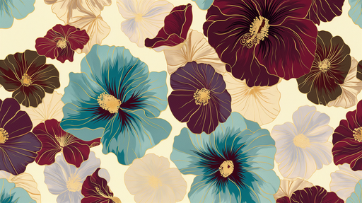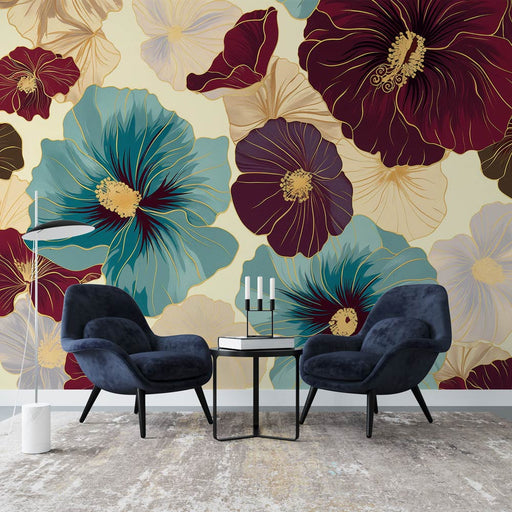 WonderMuralSee lilleline foto tapeet esitleb väljapaistvat komplekti stiliseeritud lilli erksates toonides punast, valget ja kuldset, kesköise sinise taustal....