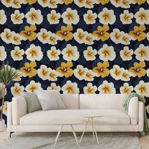 WonderMuralSee elav tapeet seinamaaling sisaldab suuri hibiski õisi sinise-halli ja kuldsetes toonides valgel taustal, luues silmatorkava ja elegantse kontras...