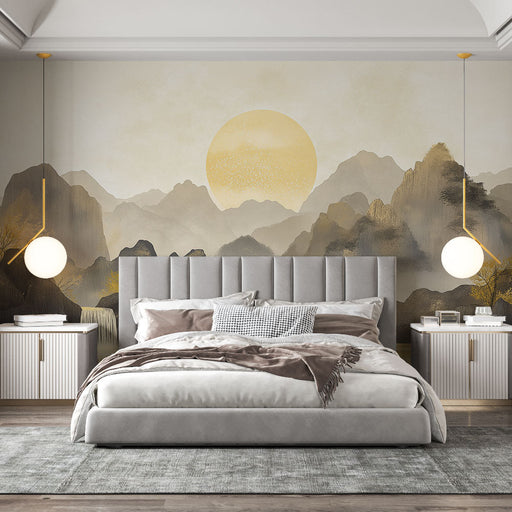WonderMuralMeie tapeet äratas rahuliku stseeni udustest mägedest, mis on üle ujutatud tõusva päikese kuldse valgusega. Halli ja kuldse varjundid annavad rahul...
