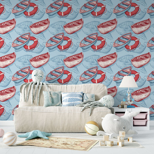 WonderMuralSee tapeet on võluv motiiv paatidest ja päästepärjadest pehmel sinisel taustal, luues mere- ja suvise atmosfääri. Õrnad joonistused on tehtud punas...