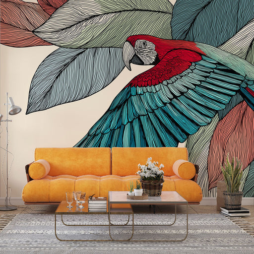 WonderMuralMeie ilus fototapeet näitab värvilist papagoid elavate sulgedega punase ja sinise toonis, graatsiliselt õitsemas suurte stiliseeritud lehtede vahel...