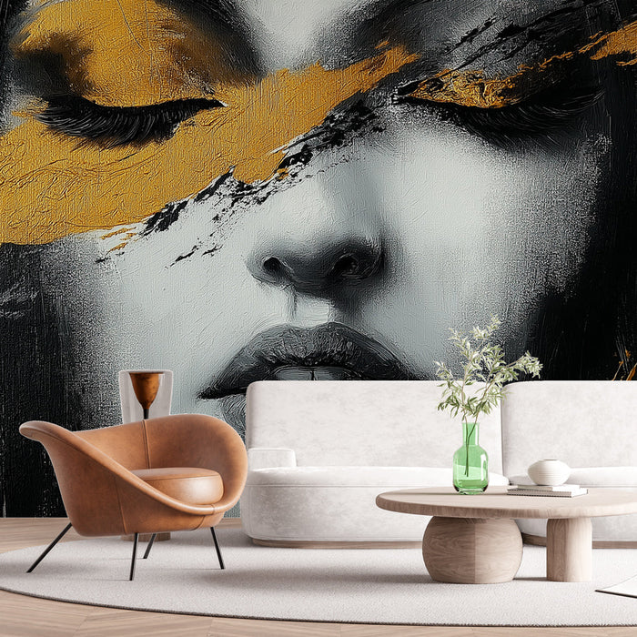 See kunstiline fototapeet paistab silma kaasahaarava abstraktse portreega, milles segunevad sügavad mustad toonid erksate kuldsete aktsentidega. Stiliseeritud ja graafiline kujutis naisnäost lisab interjöörile müstilisust ja elegantsi. Dünaamilised pintslitõmbed toovad ruumi elavat ja kontrastset energiat, luues tõelise fookuspunkti.
