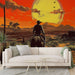 See seinamaalingu tapeet kujutab suurejoonelist päikeseloojangu maastikku lääne stiilis, kus ratsanik suundub horisondi poole. Soojad oranži ja punase toonid loovad põneva atmosfääri, samas kui mägede siluetid joonistuvad taustal välja. Kuldne valgus ja rohelised toonid lisavad kogu kompositsioonile elava mõõtme.
