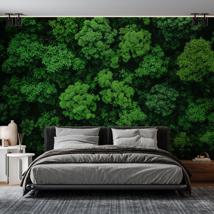 See seinamaaling pakub lummavat vaadet tihedale metsale ülalt, paljastades hulgaliselt rohelisi toone, mis tekitavad elava ja rahustava looduse tunde. Lehtede erinevad tekstuurid ja kujundid loovad rikkaliku ja dünaamilise pildi, mis on ideaalne värskuse ja elu toomiseks teie interjööri.