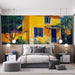 See illustreeritud seinamaalingul on hele kollane maja, mis on tüüpiline Provence'ile, kaunistatud siniste aknaluukidega ja ümbritsetud rohke taimestikuga. Kontrast helekollase fassaadi ja sinise taeva vahel loob soojendava ja tervitatava õhkkonna, mis sobib suurepäraselt iga interjööri elavdamiseks.