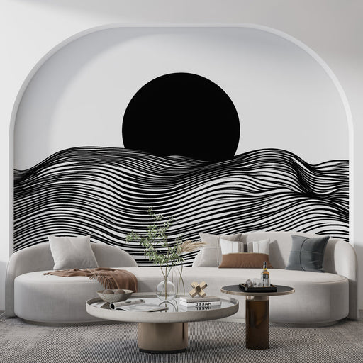 WonderMuralTämä lumoava tapetti tarjoaa kuvion tyylitellyistä aalloista mustavalkoisena, luoden graafisen ja modernin vaikutelman. Mustan ympyrän kuvaus aalto...