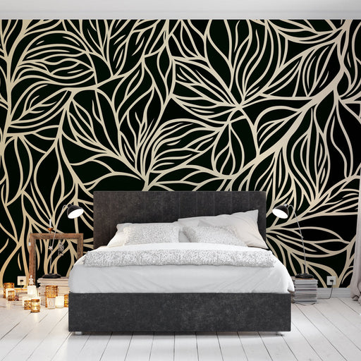 WonderMuralMustat lehdet kultaisella taustalla Tapetti Tämä seinätapetti sisältää rohkean kasvikuviokuvion, jossa on elegantisti leikattuja mustia lehtiä kult...