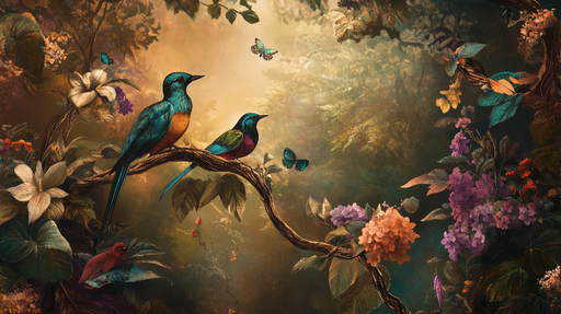 Art'lolo```html Löydä trooppinen tapettimaisema, jossa kauniisti värikkäät linnut istuvat kukkivilla oksilla. Tämä lumoava maisema on täydellinen tuomaan e...